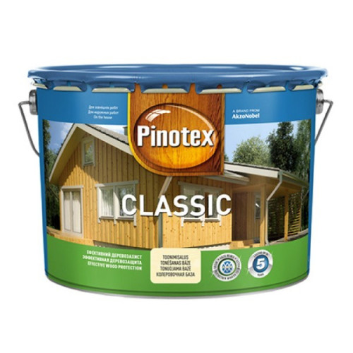PINOTEX CLASSIC - ефективне просочення на алкідній основі для декоративного оздоблення й захисту дерев’яних поверхонь від атмосферних впливів, плісняви та синяви. Рекомендується використовувати з біоцидною ґрунтовкою Pinotex Base для захисту від гнилизни більш глибоких шарів деревини. Підкреслює природну красу та фактуру