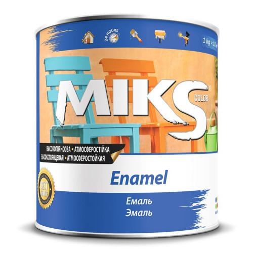 Емаль Miks - універсальна алкідна емаль для надійного захисту різних поверхонь усередині і зовні приміщень. На поверхні створюється стійкий до миття і атмосферних дій шар плівки.